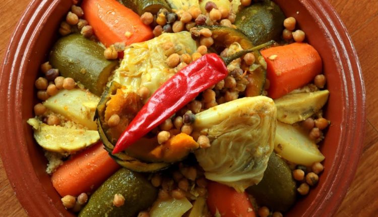 La veille, mettez les pois chiches à tremper. Le jour même, versez l’huile dans le bas du couscoussier. Faites-y fondre les oignons pelés et hachés, les pois chiches, 2 branches de cèleri, les tomates concassées et l’ail écrasé.