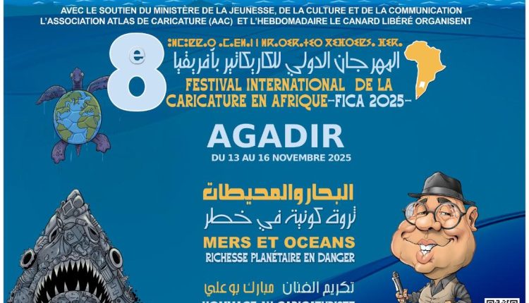 Avec le soutien du Ministère de la Jeunesse, de la Culture et de la Communication dans le cadre de son programme d’activités artistiques, l’Association Atlas de la Caricature (AAC) et l’hebdomadaire le Canard Libéré organisedu 13 au 16 novembre 2025 à Agadir la 8ème édition du Festival International de la Caricature en Afrique (FICA) et la 8ème édition du Concours International de la Caricature Maroc. Le thème choisi pour cette année est inévitablement le grand sujet qui divise le monde : « MERS ET OCEANS Richesse Planétaire En danger ».